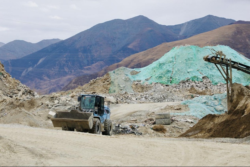 图为工人们驾驶推土机在工厂现场作业。次仁诺布 摄