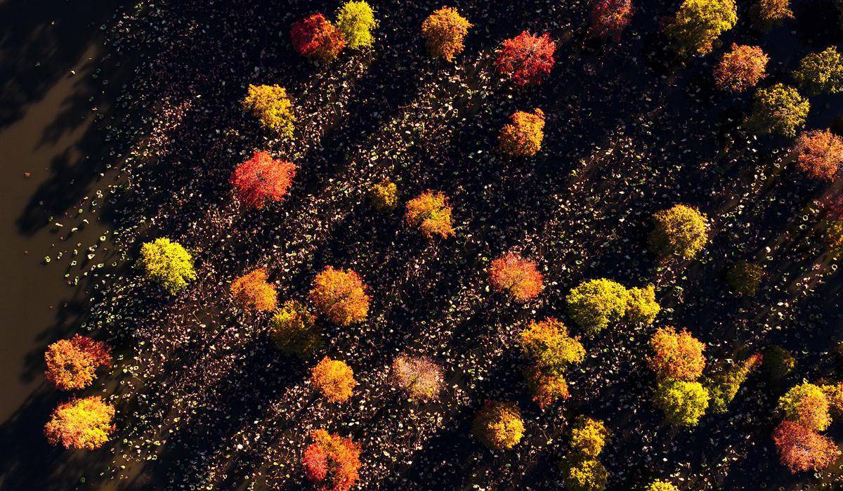 11月21日,鸟瞰武汉樟渡湖湿地公园“水上森林”,镜头前绚丽多彩。